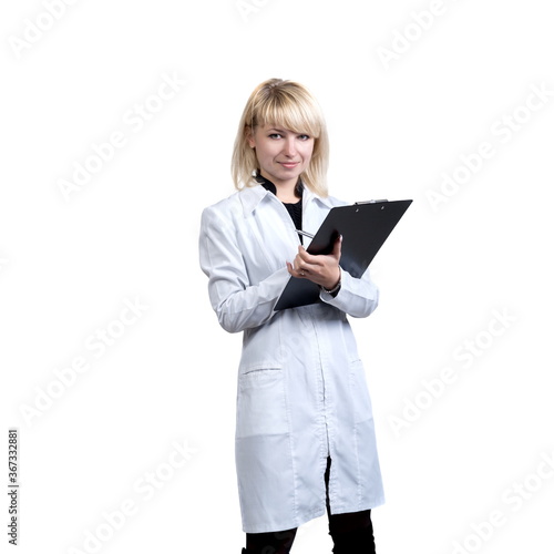 Woman in a white doctor’s suit makes a record, on a white background in isolation