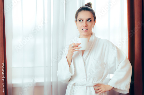 Woman in Bathrobe Starting Morning with a Cup of Coffee