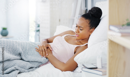Woman in bed, stomach pain and period cramps with endometriosis, health problem and sick. Female person with digestion issue, abdominal ache and menstruation with gastrointestinal emergency at home