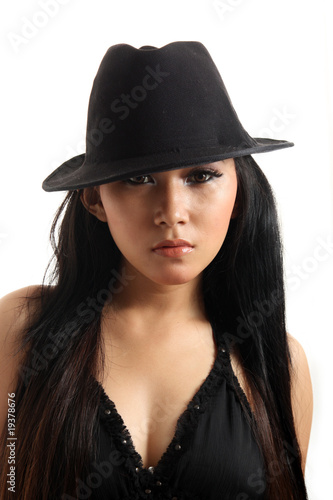 woman, hat, cap, black, dress, fashion, glamour, isolated, white, background, asian, young, 20s, female, pretty, sexy, beauty, beautiful, expression, neutral, portrait