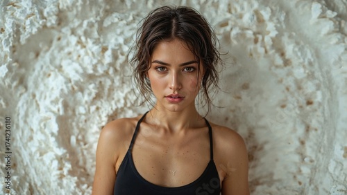 Woman in black bodysuit posing against textured white background with flour, conveying a modern and artistic portraiture style, focused expression and soft natural lighting.