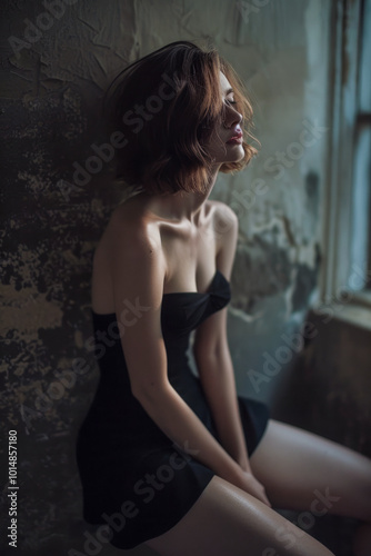 Woman in Black Dress Sitting by a Worn Wall, Bathed in Soft, Natural Light