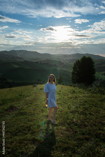 Woman in blue dress in Altai mountain,