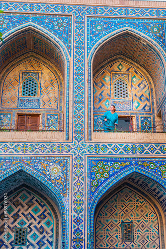 woman, holiday maker, square, samarkand, uzbekistan, courtyard, mosque, ancient, architecture, complex, asia, entrance, art, mosaic, beautiful, ornament, traditional, heritage, historic, central asia, landmark, building, tile, facades, travel, mobile phone, islam, exterior, culture, religion, minaret, attraction, mediaeval, tour tourism, blue, unesco, portal, decoration, east, arch