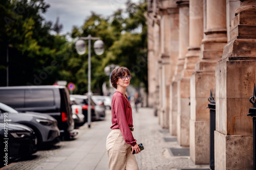 woman, strolling, walking, sidewalk, city, casual attire, fashion, lifestyle, urban, modern, street, female, adult, goggles, relaxed, trendy, stylish, architecture, building, street light, car, downtown, people, public, transportation, day, contemporary, scene, everyday, urban life, cheerful, happy, friendly, pedestrian, outfit, summer, phone, mobile, technology