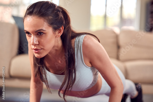 Woman In Fitness Clothing At Home In Lounge Doing Press Ups And Exercising With Hand Weights