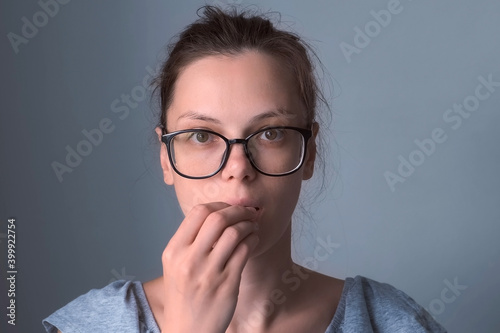 Woman in glasses is pretending she is eating looking at camera on grey background. Funny video, joke. Portrait of young woman in slow motion.