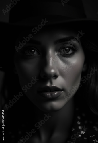 woman, hat, staring, forward, closeup, portrait, monochrome, mysterious, fashion, eye, lip, face, shadow, expression, beauty, female, detail, apparel, accessory, contemplation, emotion, people, young adult, natural light, realistic, conceptual, human face, diversity, indoor, positive, sharpened