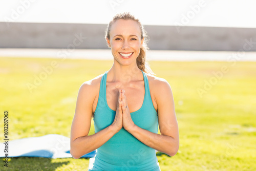 woman, wellness, serenity, fitness, meditation, vitality, nature, kneeling, grass, turquoise, activewear, athletic, exercise, prayer, palm, smiling, ponytail, daylight, sunlight, bright, field, big smile, tank top, ring, hand, healthy lifestyle, calm, peaceful, relaxation, activity, well-being, natural light, sunny day, open space, park, single person, harmony, concentration, vigour, sport