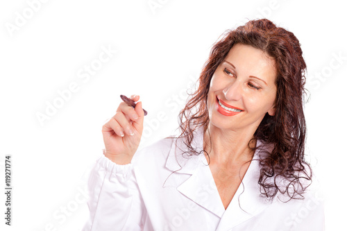 photogenic, air, beautiful, brown, doctor, drawing, gown, hand, health, health care, isolated, marker, pen, professional, vignetting, surgeon, uniform, white, woman, writing, young