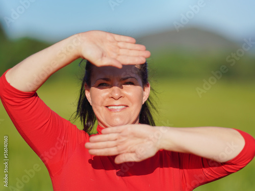 Woman in red dress standing in green field, shading her eyes from sun with one hand, another below her chin, closeup detail to face