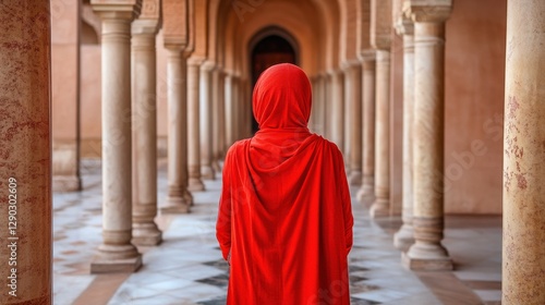 woman, red, hooded, cloak, architecture, hallway, column, historical, beauty, culture, fashion, traditional, elegant, solitude, mystique, travel, tour tourism, photo, interior, design, ornamental, pattern, heritage, symmetry, lifestyle, appearance, spirituality, serenity, landscape, exploration, minimalism, depth, perspective, artistic, expression, ambience, day, sunlight, space, peace, quiet, journey, motion, grace, emotion, style, decor