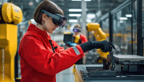 woman, men at work, factory, industrial, technology, manufacturing, robot, automation, headset, goggles, red, uniform, glove, machine, machinery, engineering, industry, future, innovation, digital, smart, modern, tech, equipment, production, process, operator, female, professional, skilled, sharpened, condensed, precision, detail, work, job, career, robotic, advanced technology, high technology, quality control