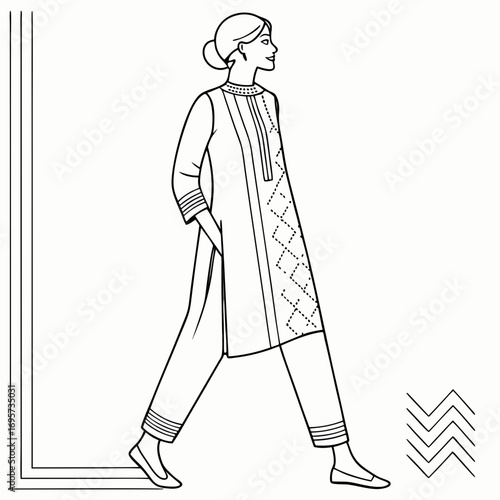 woman, traditional, indian, dress, ethnic, fashion, style, clothing, design, art, drawing, vignetting, female, person, culture, textile, pattern, motif, ornament, embroidery, print, fabric, garment, wear, outfit, formal, casual attire, elegance, grace, pose, walking, side, view, hair, bun, earring, gem, neck, sleeve, pocket, pant, shoe, footwear, minimalist, line