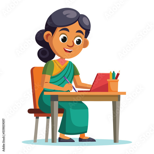 woman, saree, desk, laptop, crayons, cup, cartoon, chair, table, indian, asian, female, work, office, study, student, teacher, education, learning, drawing, illustration, design, graphic, art, clip art, character, person, people, professional, job, occupation, employee, business, corporate, company, project, task, assignment, computer, technology, cyberspace, online, digital, screen, monitor, typing, writing, creative, artist
