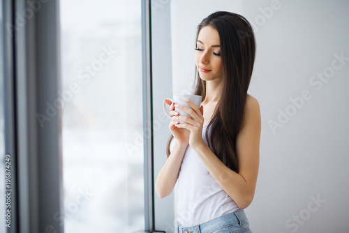 adult, attractive, awake, awakening, beautiful, beverage, blond, charming, cheerful, hot drink, concept, cup, cute, drink, drinking, female, girl, happy, holding, home, indoor, lifestyle, looking, lovely, morning, mug, nice, people, person, pretty, relaxed, room, sexy, smiling, tea, underclothing, white, window, woman, young