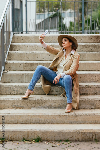 Woman in stylish warm clothes taking a selfie with a mobile phone while sitting on stairs in the street.