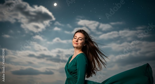 woman, dress, teal, green, night, sky, moon, cloud, hair, breeze, portrait, fashion, beauty, model, serene, peaceful, atmosphere, night time, long, dark, clothing, elegant, style, pretty, calm, happy, dreamy, romantic, photo, image, posh