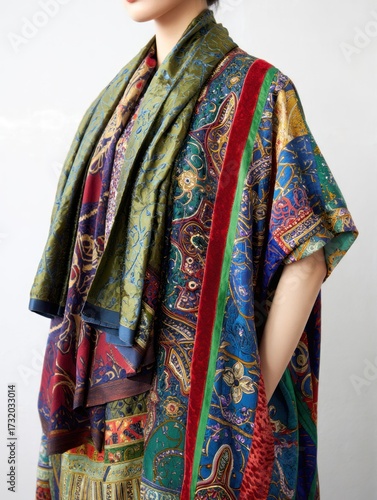 kimono, woman, silk, pattern, vibrant, traditional, elegant, clothing, fashion, cultural, heritage, fabric, textile, artistry, design, colourful, luxury, apparel, garment, ethnic, oriental, decorative, ornate, stylish, beauty, aesthetic, rich, texture, draped, modern, classic, feminine, luxurious