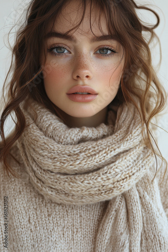 woman, white, knit up, foulard, fashion, style, winter, portrait, elegant, beauty, soft, cosy, warmth, trendy, closeup, accessory, snow, cold, season, outfit, fabric, texture, comfortable, graceful, model, chilly, female, beautiful, chic, casual attire, fashionable, classic, trend, neutral, cream, threaded, long, loop, neck, stylish