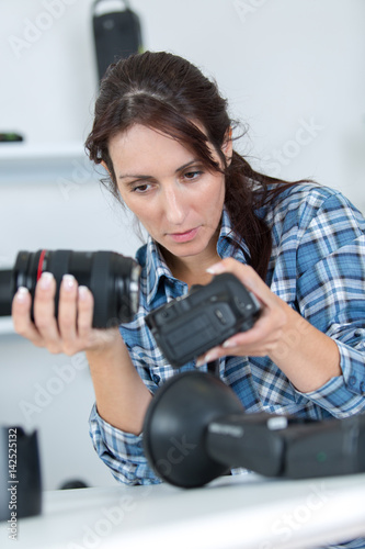 camera, lens, repair, optical, hand, technology, service, professional, equipment, expertise, device, digital, display, zoom, view, aperture, telephoto, electrical, skill, work, occupation, concentration, workbench, woman, brunette, journalist, technician, assemble, component, photo