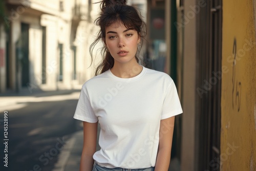 template, logotype, brand, white, oversize, t-shirt, blank, empty, woman, city, street, fashion, beauty, urban, person, outdoors, model, walking, face, lifestyle, 1, lady, outside, shopping, business, style, casual attire
