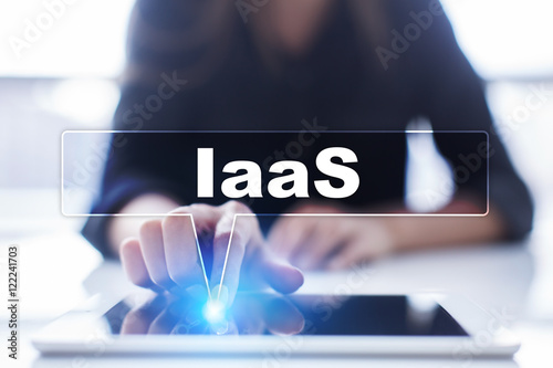 Woman is using tablet pc, pressing on virtual screen and selecting "IaaS".