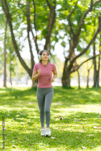 Woman Jogging in Park with Headphones