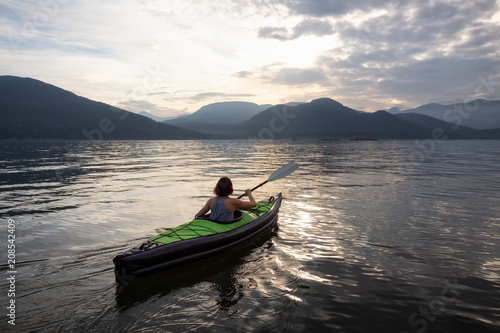 Woman kayaking around the beautiful Canadian Mountain Landscape during a vibrant cloudy evening. Taken in Howe Sound, North of Vancouver, British Columbia, Canada.