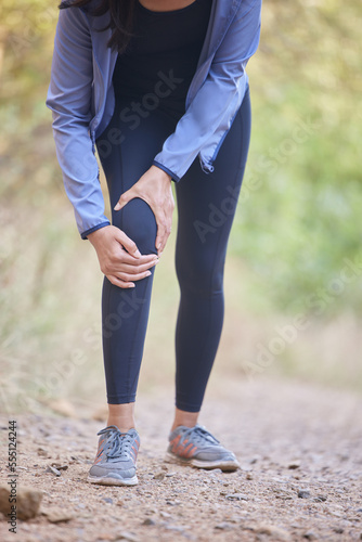 Woman, legs and runner knee pain outdoor for fitness exercise, cardio workout accident or training in nature park. Joint pain, leg wellness emergency or athlete person with running injury in forest