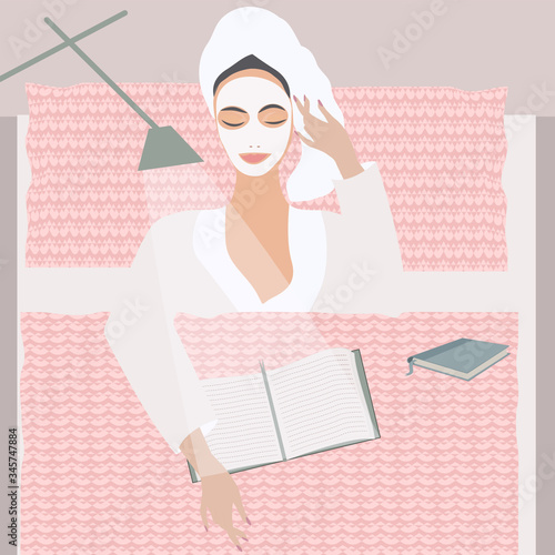 Woman lies in bed, cosmetic mask on her face, reading a book - vector. Quarantine. Mental health Interior. Self-employment. Personal care
