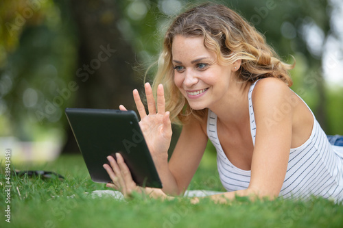 woman, leaning, casual attire, modern, outdoors, ipad, portrait, carefree, people, joy, cheerful, touchpad, digital, relaxing, earphones, park, smile, happiness, technology, using, wearing, tablet, caucasian, device, summer, happy, holding, wireless, grass, toothy, smiling, touching, girl, music, young adult, day, computer, attractive