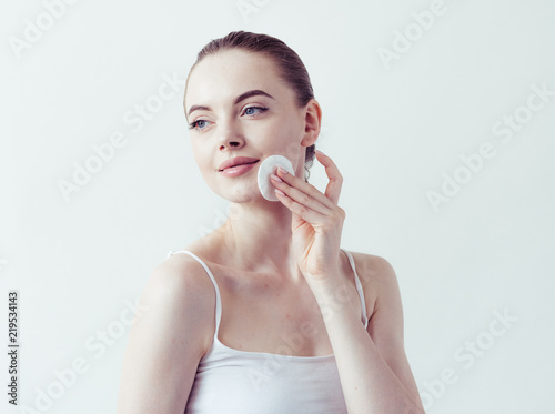 Woman makeup remove with cotton pad beauty healthy skin clean face