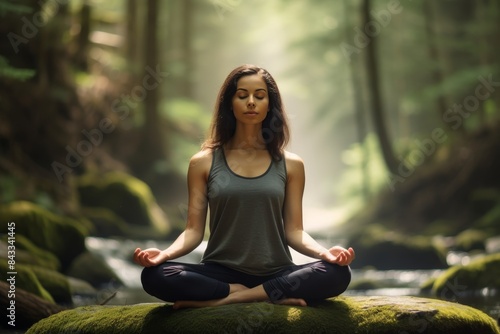 Woman Meditates in Tranquil Forest Setting During Summer Morning
