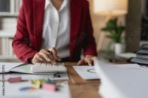 woman meticulously plans a finance audit, using a computer and calculator to review budget documents and ensure accuracy