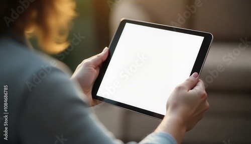 tablet, blank screen, woman, hand, technology, digital, app, device, contraption, modern, lifestyle, relaxation, home, comfortable, neutral, warm, soft light, indoor, sunlight, casual attire, grey, beige, white, online, cyberspace, communication, website, application, design, template, marketing, advertising, presentation
