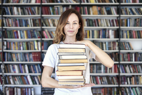 Woman model college student with books at library holds bunch of books, looks smart, smiling to camera. bookshelves at the library. Knowledge and self-development
