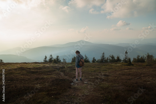 Woman on the summit of Králický Sněžník between Poland and the Czech Republic, at sunset, high mountain meadow, with Czarna Gora in the background. Classic hiking with a backpack.