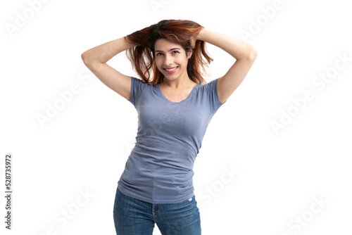 Woman on white background holding her hair with her hands