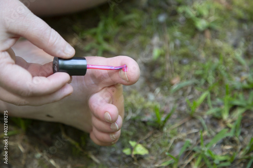 painting, nail, toenail, toe, polish, beauty, style, fashion, grass, ground, foot, outdoors, outside, vegetation, green, greenery, growth, look, appearance, colours, colouring, bright, pink, person, human, lady, female, girl, woman, finger, hand, skin, lifestyle, pretty, leg, background, nail, stylish, applicator, brush, apply, applying, application, polishing, nail polish