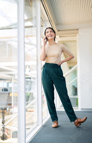 Woman, phone call and happy with thinking at office by glass with talk, networking and contact at startup. Person, smartphone and smile by window, solution and project management at creative agency