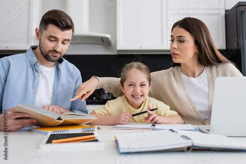 woman pointing at book in hands of husband while helping cheerful daughter doing homework