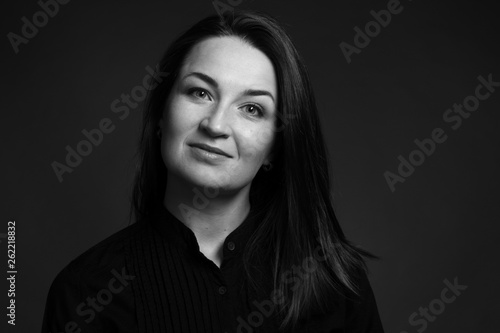 woman, portrait, young, beauty, beautiful, face, hair, fashion, brunette, black, model, studio, person, dark, eye, lady, smile, cute, 1, white, smiling, people, teenage, brown, looking, female, work, business, adult, alluring, attractive, black-and-white, bw, caucasian, closeup, closeup, covered, finger, french, good, hand