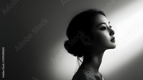 woman, portrait, black-and-white, monochrome, light, shadow, face, profile, beauty, elegant, graceful, coiffure, bun, neck, skin, studio, background, artistic, serene, calm, peaceful, contemplative, thoughtful, looking up, dreamy, aethereal, female, model, person, human, head shot, half face, contrast, greyscale, simplicity, minimalist, delicate, refined, sophisticated, classic, timeless