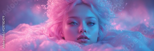 woman, portrait, beauty, pink, blue, glow, dreamy, aethereal, neon, glistering, pastel, sparkle, iridescent, soft, light, surreal, fantasy, cloud, hair, eye, lip, skin, make-up, fashion, art, atmosphere, abstract, romantic, vibrant, delicate, mystical, radiant, floating, serene, calm, hypnotic, digital, glossy, glamour, style