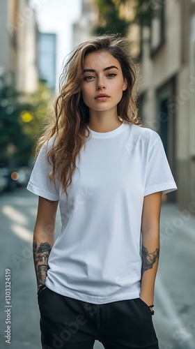 woman, girl, model, portrait, street, city, urban, fashion, style, beauty, pretty, photoshoot, photo, casual attire, summer, posing, hair, eye, tattoo, clothes, t-shirt, jean, look, aesthetic, beautiful, gorgeous, attractive, young, cool, chic, trendy, image, picture