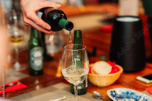 woman, caucasian, adult, hand, part of, hold, summing, pour, champaign, vodka, wine, bottle, glasses, alcohol, drink, beverage, fresh, refreshment, celebration, table, alone, indoor, people