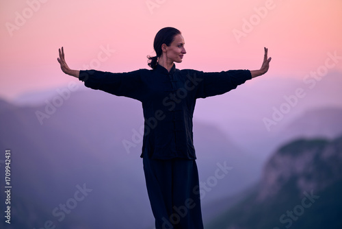 Woman practicing Tai Chi in traditional black outfit on mountain at sunrise, arms outstretched in meditation pose focusing on balance, energy, and mindfulness in nature.