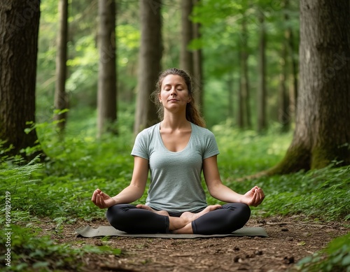 woman practicing yoga in forest among greenery. concept of calm and peace.