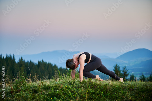 Woman practicing yoga outdoors in the mountains in a serene, natural setting. Female performing yoga pose, with backdrop of beautiful mountain landscape at sunrise or sunset.